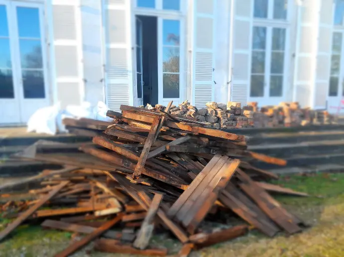 Malheureusement trop abîmé pour être rénové, le parquet sur lambourdes du Salon a été entièrement démonté et retiré. Une chape isolante vient d'être coulée. Suie des travaux début janvier.